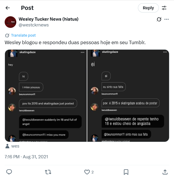 (2) “Wesley blogou e respondeu duas pessoas hoje em seu Tumblr.”