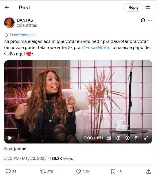 (2) “na próxima eleição assim que votar eu vou pedir pra desvotar pra votar de novo e poder falar que votei 2x pra @ErikakHilton, olha esse papo de visão aqui 💖:”