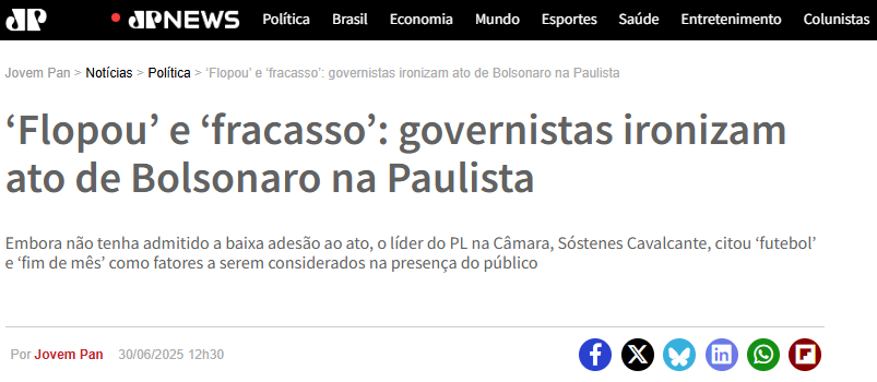 Fonte: https://jovempan.com.br/noticias/politica/flopou-e-fracasso-governistas-ironizam-ato-de-bolsonaro-na-paulista.html. Acesso em: 18 set. 2025.