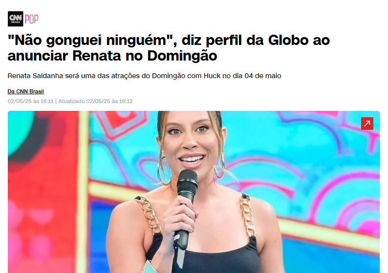 Fonte: https://www.cnnbrasil.com.br/entretenimento/bbb/nao-gonguei-ninguem-diz-perfil-da-globo-ao-anunciar-renata-no-domingao/. Acesso em: 06 dez. 2025.