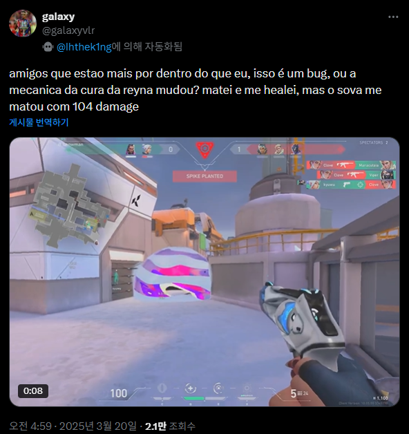(2) “amigos que estao mais por dentro do que eu, isso é um bug, ou a mecanica da cura da reyna mudou? matei e me healei, mas o sova me matou com 104 damage”