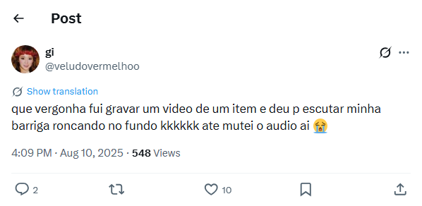 (2) “[…] deu p escutar minha barriga roncando no fundo kkkkkk ate mutei o audio ai 😭”