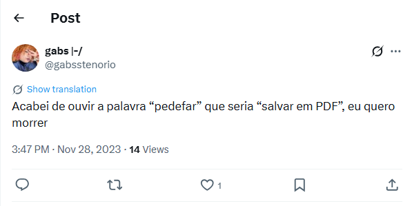 (1) “Acabei de ouvir a palavra ‘pedefar‘ que seria ‘salvar em PDF’, eu quero morrer”