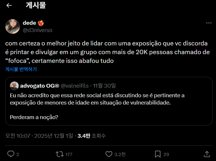 (2) “com certeza o melhor jeito de lidar com uma exposição que vc discorda é printar e divulgar em um grupo com mais de 20K pessoas chamado de “fofoca”, certamente isso abafou tudo”