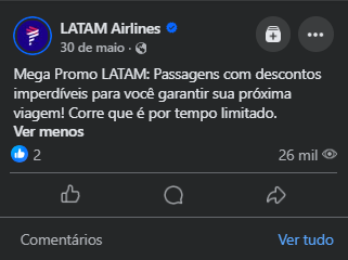 (1) “Mega Promo LATAM: Passagens com descontos imperdíveis para você garantir sua próxima viagem! Corre que é por tempo limitado.”