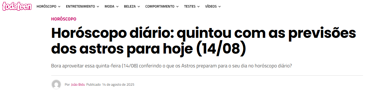 Fonte: https://todateen.com.br/noticias/horoscopo-diario-quintou-com-as-previsoes-dos-astros-para-hoje-14-08.phtml. Acesso em: 09 dez. 2025.
