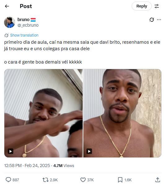 (2) “primeiro dia de aula, caí na mesma sala que davi brito, resenhamos e ele já trouxe eu e uns colegas pra casa dele […]”
