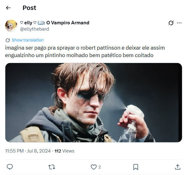 (2) “imagina ser pago pra sprayar o robert pattinson e deixar ele assim engualzinho um pintinho molhado bem patético bem coitado”